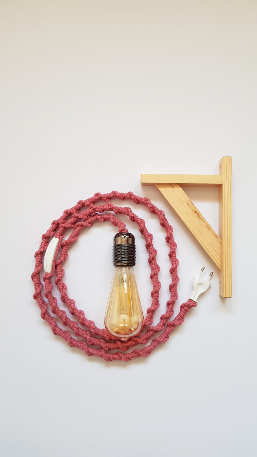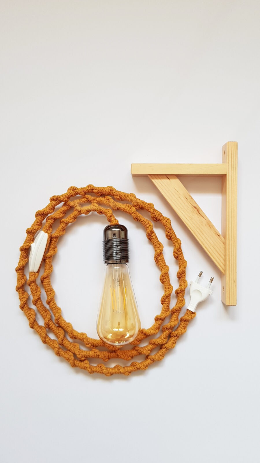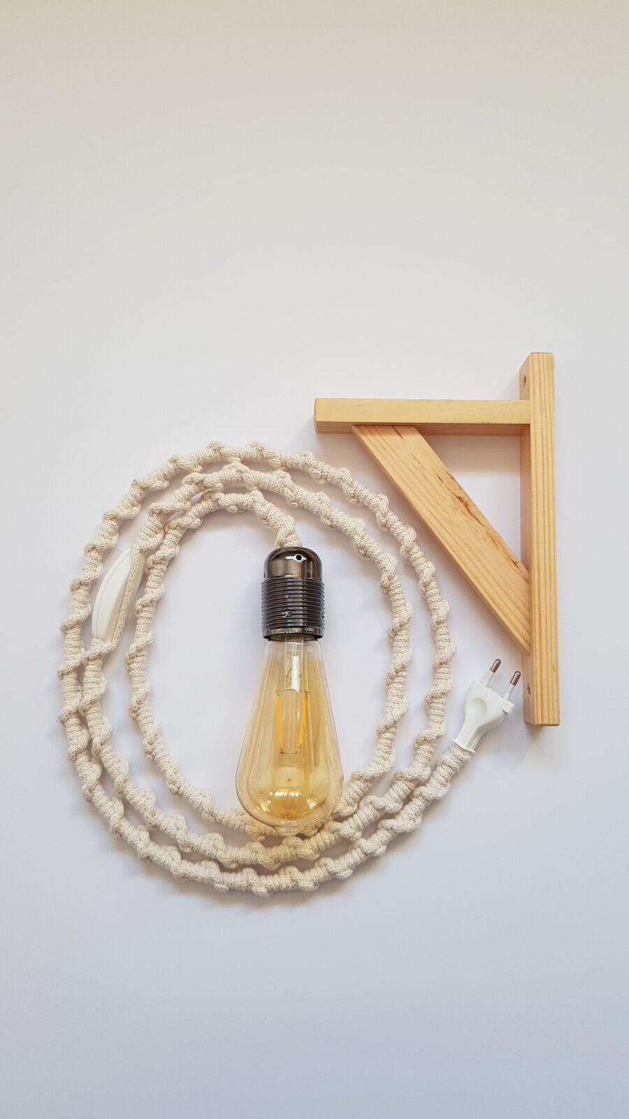 W skład zestawu wchodzi lampa z makramy, żarówka ozdobna podłużna oraz wieszak drewniany.
