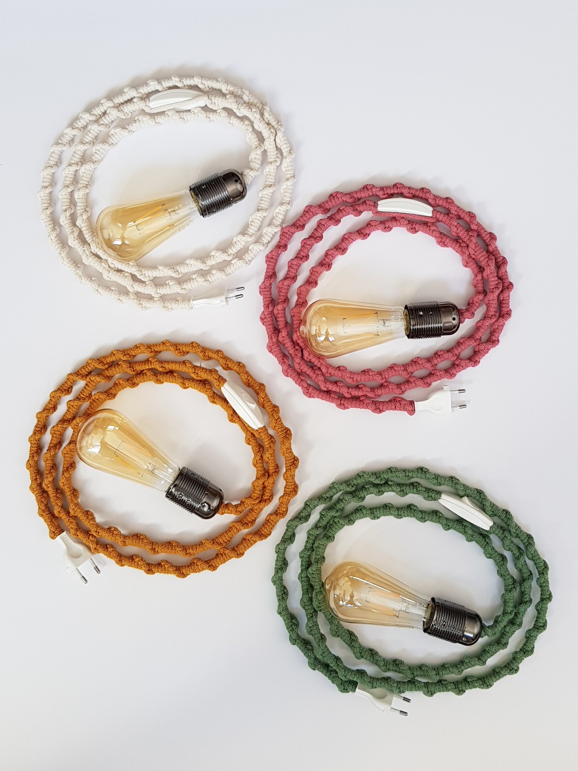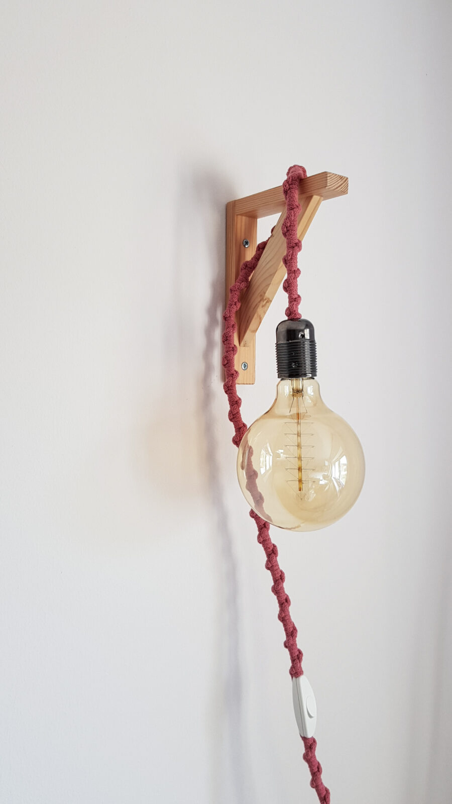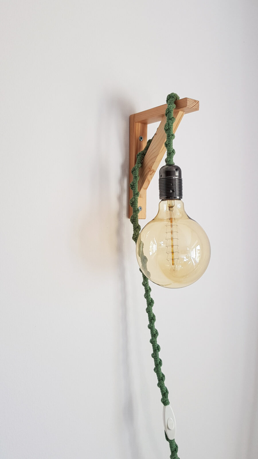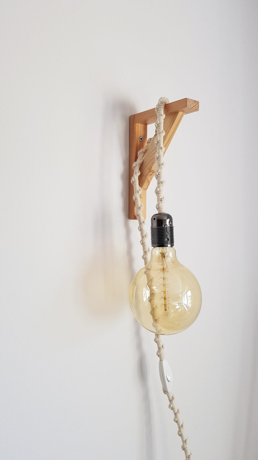 W skład zestawu wchodzi lampa z makramy, żarówka ozdobna podłużna oraz wieszak drewniany.